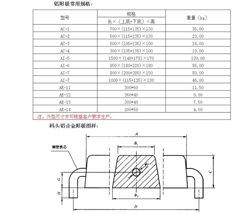 塊狀陽極:是常見的一種,尺寸多樣,可根據碼頭的具體結構和保護需求進行選擇和定制,通常用于碼頭的水下部分、鋼樁等部位的保護。