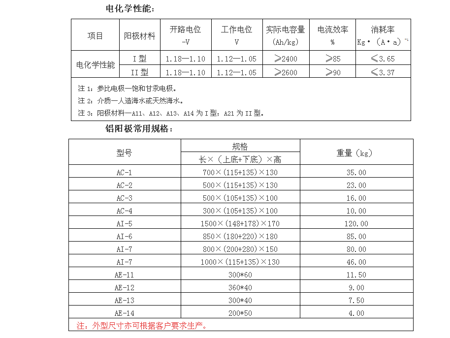 產品概況  管狀鋁合金陽極是一種具有特定形狀和功能的鋁合金制品,它是以鋁合金為材質,經過特殊工藝加工而成的管狀物體,在多個領域發揮著重要作用。特點電化學性能優越:具有極高的電化學性能,單位重量的陽極材料發電量較大,約為鋅陽極的 3 倍,鎂陽極的 2 倍。耐腐蝕性強:鋁合金本身具有一定的耐腐蝕性,經過陽極氧化處理后,表面形成一層致密的氧化鋁薄膜,進一步提高了其耐蝕性能,能有效抵抗外界環境的侵蝕。重量輕:鋁合金的密度相對較低,相比其他金屬材料制成的陽極,管狀鋁合金陽極重量較輕,便于運輸和安裝。可加工性好:鋁合金具有良好的可加工性,可以根據實際需求加工成各種形狀和尺寸的管狀陽極,滿足不同應用場景的要求。成本效益高:由于鋁合金的原材料成本相對較低,且生產工藝較為簡單,因此管狀鋁合金陽極的生產成本相對較低,具有較高的性價比。主要性能指標電極電位:通常為 - 1.05V(相對于飽和甘汞電極)左右,這使得它在電解質溶液中能夠作為陽極發生氧化反應,為被保護的金屬提供陰極保護。電流容量:指陽極在一定時間內能夠提供的電量,單位為安培?小時(A?h)。電流容量越大,陽極的使用壽命越長。電流效率:是指陽極實際輸出的電量與理論電量之比,通常以百分比表示。電流效率越高,陽極的電化學性能越好。工作溫度范圍:管狀鋁合金陽極的工作溫度范圍一般在 - 20℃至 60℃之間,在這個溫度范圍內,陽極能夠正常工作,發揮其應有的保護作用。應用領域船舶工業:用于船舶的船體、螺旋槳、壓載艙等部位的防腐保護,防止海水對船舶金屬結構的腐蝕。海洋工程:如海上平臺、海底管道、港口設施等,可有效保護這些海洋工程設施免受海水和海洋環境的侵蝕。石油化工:在石油化工行業中,用于儲存和運輸石油、天然氣等介質的儲罐、管道等設備的防腐保護。電力行業:可用于發電廠的循環水系統、冷卻水塔等設備的防腐保護,防止水中的溶解氧和其他腐蝕性物質對設備的侵蝕。其他領域:還可應用于建筑行業的鋼結構防腐、橋梁防腐、汽車制造等領域。生產工藝熔煉:將純鋁和其他合金元素(如鋅、銦、鎘等)按照一定的比例加入到熔爐中,加熱至一定溫度(通常在 700℃至 750℃之間),使其充分熔化和混合。鑄造:將熔煉好的鋁合金液體倒入預先設計好的模具中,冷卻凝固后得到鋁合金鑄錠。擠壓:將鋁合金鑄錠加熱至一定溫度(通常在 400℃至 500℃之間),然后放入擠壓機中進行擠壓,得到管狀鋁合金陽極坯料。加工:對擠壓得到的管狀鋁合金陽極坯料進行進一步的加工,如切割、鉆孔、攻絲等,以滿足不同應用場景的需求。表面處理:為了提高管狀鋁合金陽極的耐蝕性能和外觀質量,通常需要對其進行表面處理,如陽極氧化、涂漆等。質量控制原材料檢驗:對采購的純鋁和其他合金元素進行嚴格的檢驗,確保其化學成分和物理性能符合要求。生產過程控制:在生產過程中,嚴格控制熔煉溫度、鑄造工藝、擠壓工藝等參數,確保產品的質量穩定。成品檢驗:對生產出的管狀鋁合金陽極進行檢驗,包括外觀檢查、尺寸測量、電化學性能測試等,確保產品符合相關標準和客戶要求。質量追溯:建立完善的質量追溯體系,對每一批產品的原材料、生產過程、成品檢驗等信息進行記錄,以便在需要時能夠追溯產品的質量狀況。我公司生產的鋁合金犧牲陽極采用優良的原材料(鋁陽極原料純度不低于90%)多重質檢工藝(雜質質檢、金相顯微分析、全套化學分析),成熟的生產工藝嚴格的儀器檢驗,陽極鐵芯檢測確保每支陽極符合國標要求,符合客戶定制需求。  該產品具有以下特點:  (1)電位穩定,電流效率高;  (2)重量輕,安裝方便;  (3)理論電容量大、保護鋼結構時具有自動調節保護電位的作用。  陽極分類:  (1)普通鋁合金犧牲陽極;  (2)高 效鋁合金犧牲陽極;  (3)耐高溫鋁合金犧牲陽極;  (4)梯形、圓盤形、鐲式等形狀犧牲陽極。  注意事項:  (1)與鋼結構撞擊有引發火花的可能性;  (2)不易用在高電阻率的介質中。規格參數產品應用